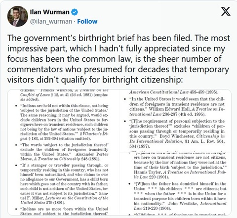 It quotes expert after expert after expert – all contemporaneous to the time the amendment was being considered, then adopted, and all of them offer explanations that those children of foreigners, of temporary residents or transient travelers passing through, are not U.S. citizens.