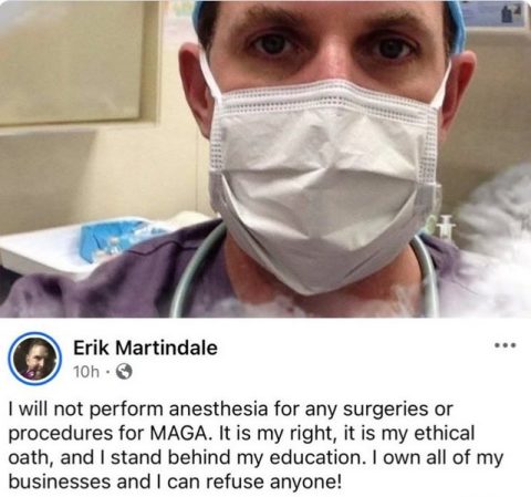 On Sunday, an anesthesiologist named Erik Martindale sparked a social media uproar after posting on his Facebook account that he would let MAGA supporters suffer and refuse to perform any anesthesia on MAGA clients.