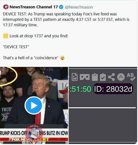 DEVICE TEST: As Trump was speaking today Fox’s live feed was interrupted by a TEST pattern at exactly 4:37 CST or 5:37 EST, which is 17:37 military time.