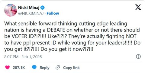 During his discussion, Enten referenced an X post Nicki Minaj posted on Sunday which stated, ” What sensible forward thinking cutting edge leading nation is having a DEBATE on whether or not there should be VOTER ID?!?!!!!