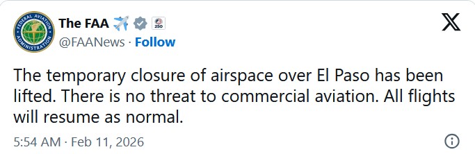 The federal government reopened the airspace over El Paso International Airport in Texas on Wednesday morning following a temporary closure for previously unspecified reasons.