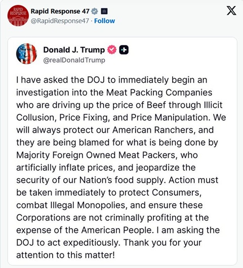 Trump directed the DOJ to investigate the meat packing companies who are driving up the prices through illicit collusion, price fixing and price manipulation.
