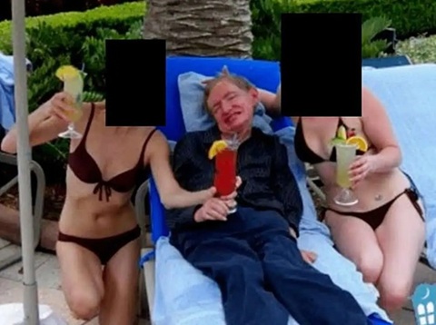 Among the materials published by the DOJ is a photograph showing Hawking seated in his wheelchair between two bikini-clad female victims holding tropical drinks.