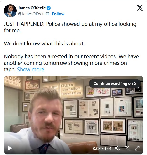 “Police showed up at my office looking for me,” James O’Keefe said.