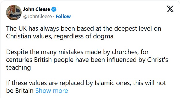 “Mr Cleese, you and your boomer celeb ilk mocked Christianity relentlessly, and not just through Life Of Brian… and now you are wondering what happened to the Britain of Christian values… do you read what you have written?” one commenter said.