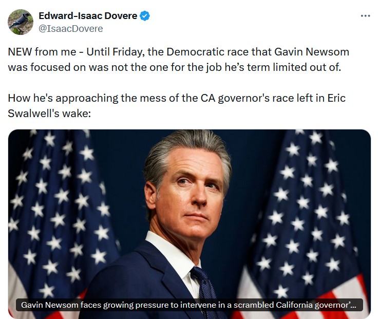 Governor Gavin Newsom — the outgoing governor who has been eyeing a national political future — is now reportedly in a “marathon of calls and meetings” trying to figure out what to do. His problem is that he doesn’t love any of the remaining Democratic candidates.
