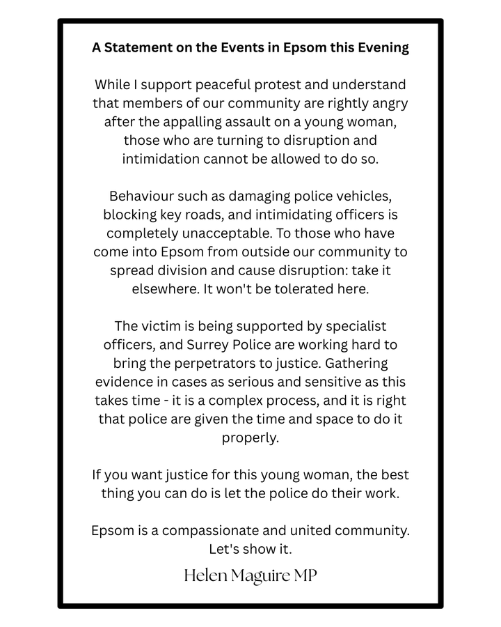 Meanwhile, the local Member of Parliament for Epsom, the Liberal Democrat’s Helen Maguire criticised the protesters, claiming the event had been hijacked by “right-wing online activists” who want to “fan the flames of divisiveness”, reports the BBC. She said: “To those who have come into Epsom from outside our community to spread division and cause disruption, take it elsewhere, it won’t be tolerated”.