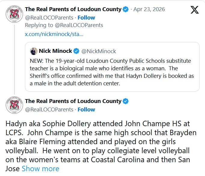 Hadyn Dollery, of Chantilly, a biological man who identifies as a transgender “woman,” was taken into custody on Monday at John Champe High School in Stone Ridge.